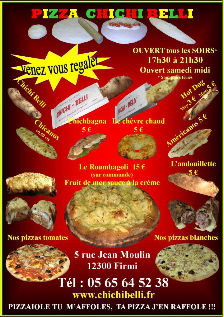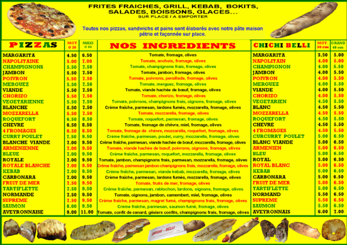 Tarifs de nos pizzas, ChichiBelli et autres spécialités !